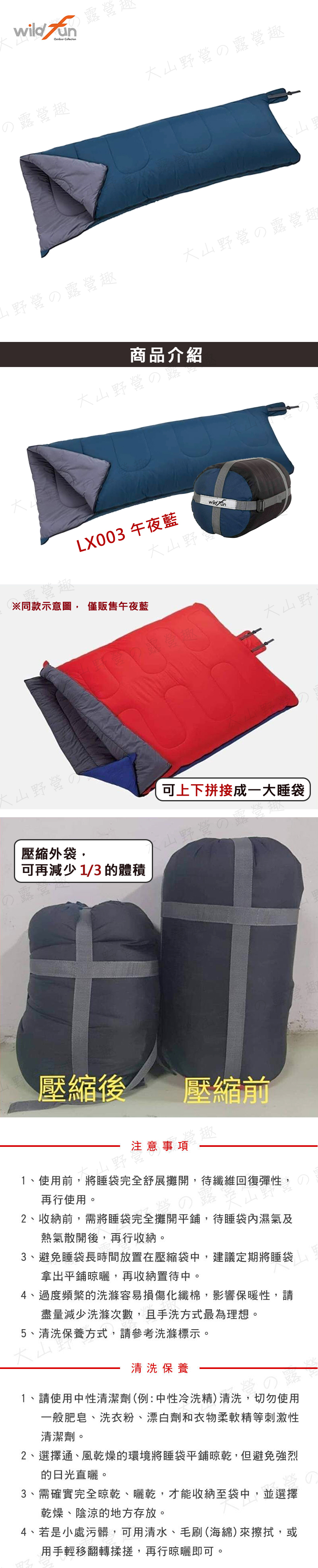 【大山野營】台灣製 WildFun 野放 LX003 輕巧舒適方型睡袋 纖維睡袋 T3科技保暖棉 可拼接全開 信封型睡袋 居家 露營