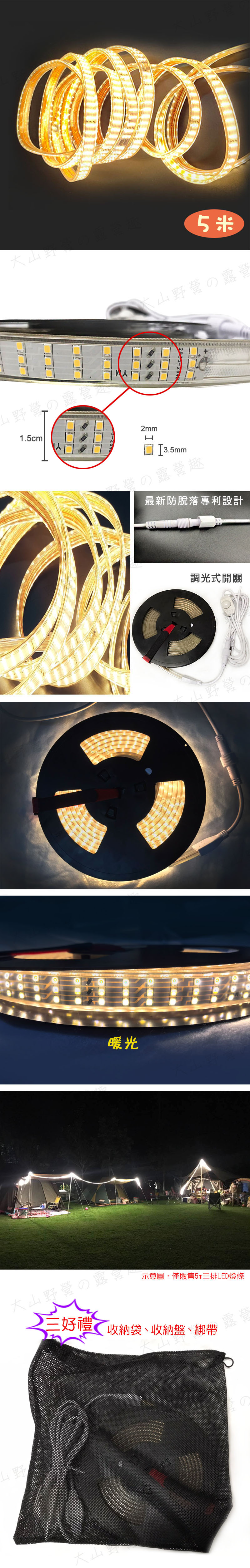 【大山野營】贈收納袋收納盤 新店桃園 2835-5 5米 三排LED燈條 調光式 暖光 露營燈 氣氛燈 客廳帳天幕帳可用